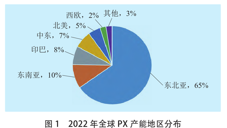 全球PX产能7317.7万吨/年,产量5477.8万吨。从地区分布来看,东北亚占据全球65%的产能分布,其次是东南亚、印巴、中东、北美和西欧(见图1)。