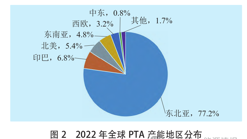 近10年来,全球PX产能持续扩张,2013年以来年均产能增速7%,新增产能主要集中在亚洲,我国与周边国家的市场竞争更加激烈。2022年,全球PTA产能达9701.3万吨/年,产量8223.7万吨。从地区分布来看,东北亚占据PTA产能主导地位,2022年,东北亚PTA产能占全球比重达77.2%,是全球PTA的生产和消费中心(见图2)。我国是全球最大的PTA生产国,预计未来5年全球PTA新增产能主要来自我国。