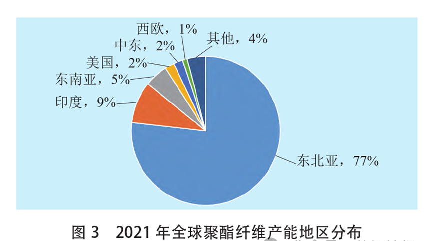 2022年,全球PET产能1.2亿吨/年,按产品形态划分,PET下游大宗产品主要包括聚酯纤维、聚酯瓶片、薄膜等。据相关报告显示,2021年,全球聚酯纤维产能8560万吨/年,因我国新装置不断投产,东北亚产能占比进一步提升,约占全球产能的77%,其次为印度,占9%,其余产能主要分布于东南亚、欧美和中东地区(见图3)。