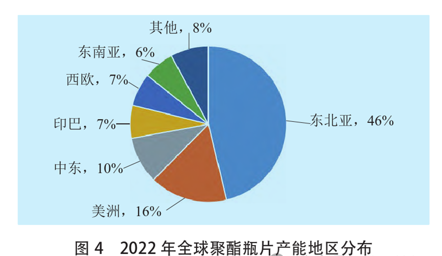 聚酯瓶片方面,2022年,全球产能3445.4万吨/年,其区域分布相对广泛,东北亚产能占比最高,达46%,其次是美洲、中东、印巴、西欧和东南亚地区(见图4)。2020—2024年,全球聚酯瓶片产能年均复合增长率为5.6%,我国预计达9.7%,将进一步提升在全球产能占比。