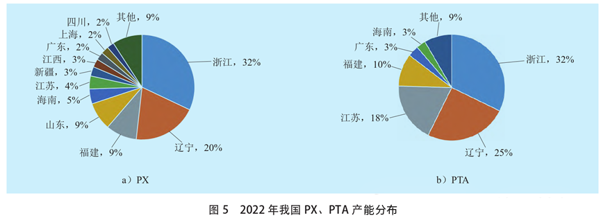 得益于经济发达程度和物流、消费市场等因素,我国芳烃产业链各生产环节主要集中于东部沿海省份。2022年,我国PX产能区域分布相对广泛,浙江、辽宁、福建、山东4省占比较高;按区域分析,华东地区的产能占全国比重达64%,东北和华南地区占比分别达20%和7%,东部沿海省份产能占比达83%。2022年,我国PTA产能分布更加集中,浙江、辽宁、江苏、福建4省合计占全国比重达85%,东部沿海省份产能占比达95%(见图5)。