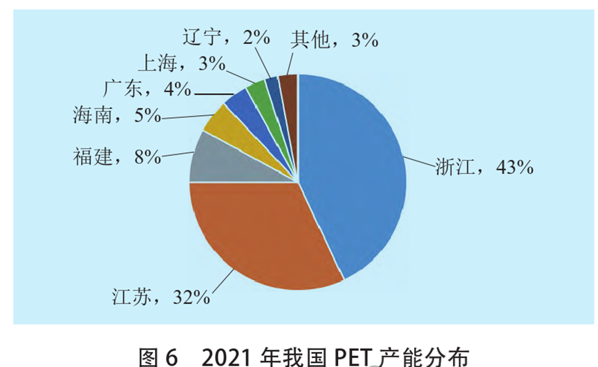 目前国内PET行业发展成熟,产业集中度已达较高水平。据中国化学纤维工业协会发布的2022年我国聚酯产量排名,前10名全部来自浙江和江苏,前30名中,浙江、江苏企业占比超2/3。2021年,浙江、江苏两省的PET产能占全国总产能75%(见图6),福建也是PET主要产地,占比8%,东部沿海省份产能占比达97%。